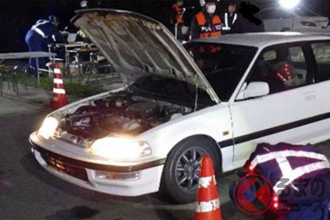 添付されている写真には、車高を下げた黒いスポーツカーや騒音の検査を受ける旧車のハッチバック車などが検査されています。主に見つかった不正改造は、騒音規制値オーバーや回転部分突出(ハミタイ)だったということです。