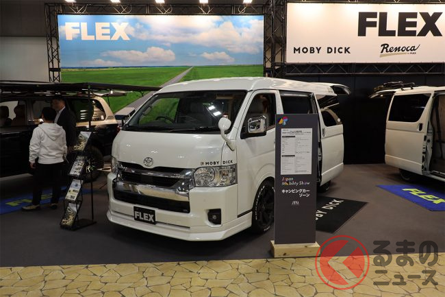 また、FLEXが企画・製造するハイエースをベースとしたキャンピングカー「モビーディック」からは、「オルカ」「ベルーガ」「NH#01」などが出展されています。