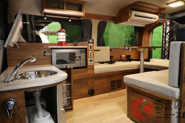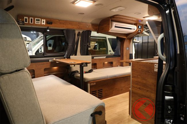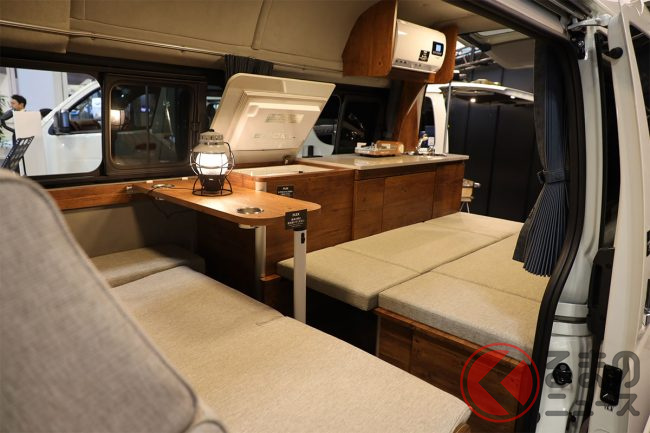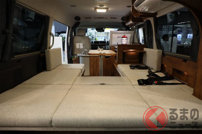 今回展示された個体は、エクステリアがブラックとゴールドとグリーンの3トーンに塗り分けられているほか、インテリアはドロワーキットの上部に設けられたフラットな空間にクッションフロアが敷き詰められていることで「本気で寝られる」仕様となっています。