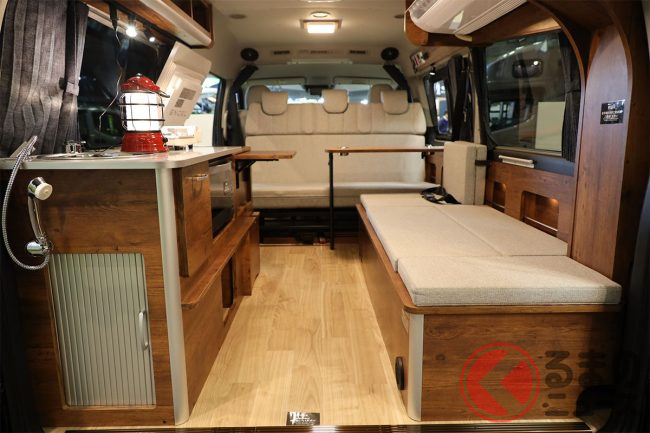 同じくミドルルーフ・ワイドボディのハイエースワゴン「GL」をベースとしたベルーガは、フルフラットなベッドと機能的なキッチンを兼ね備えながら、3人掛けの2列目シートを生かしてファミリーカーとしても利用できるのが魅力です。