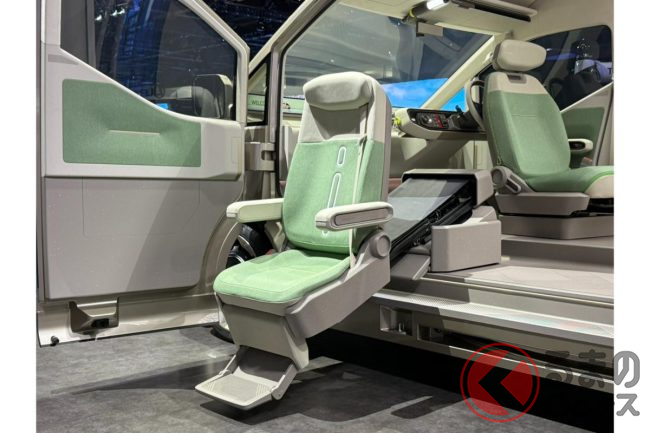 異形のステアリングにはアクセルとブレーキ操作機能が備わっており、手だけで運転操作が可能。つまり、足の不自由な人でも運転できるのです。今回のコンセプトでは、三脚の個人用モビリティ「walk me」を使って車内に乗り込み、運転と配達を行うことが展示されていました。