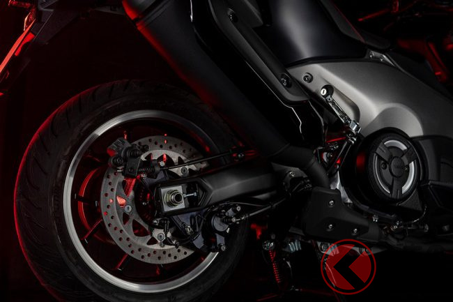この25周年記念モデルは、2006年に登場した「TMAXスペシャル」からインスピレーションを受けています。ボディには専用のダークグレーメタリック塗装が施され、赤クロームのTMAX 3Dバッジが配置されています。足元にはリムに機械加工が施されたブラックホイールが装着され、美しいコントラストを演出しています。