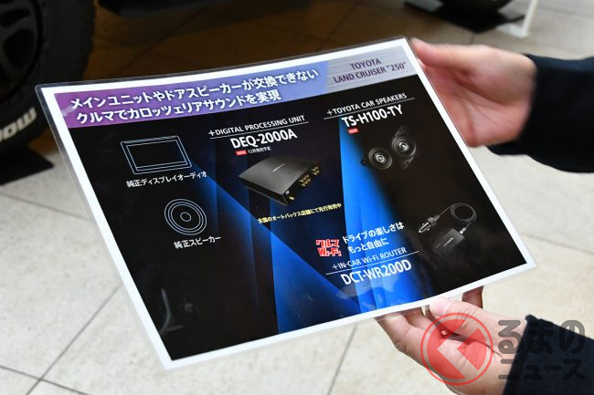 続いて体感したのは、トヨタのプリウスとランドクルーザー250です。近年のトヨタ車はディスプレイオーディオが純正で備わることで社外品への交換が難しく、ドアスピーカーもセンサーや配線の関係で交換が推奨されていないため、今までのクルマのように気軽にアップグレードができないのが悩ましいところ。