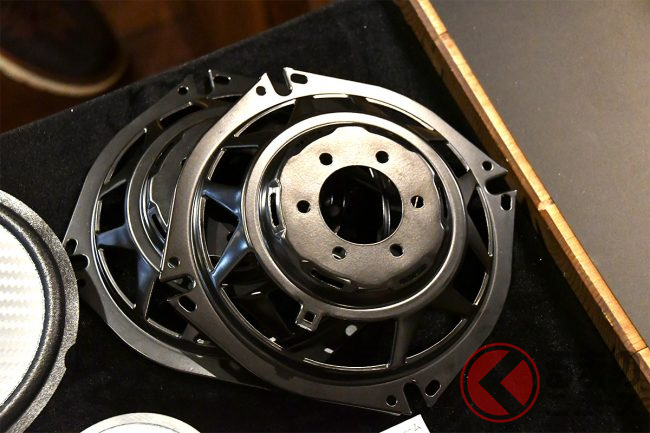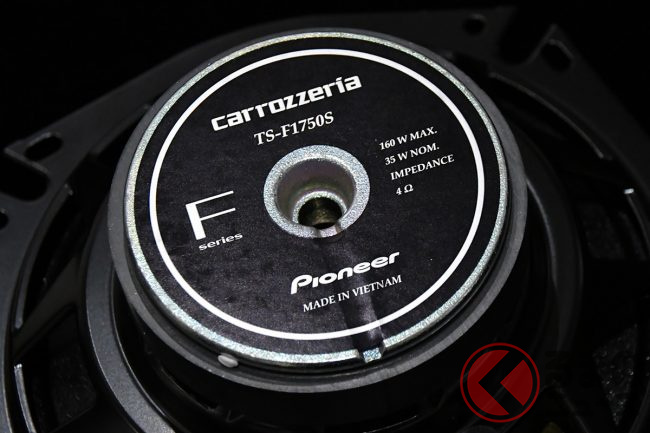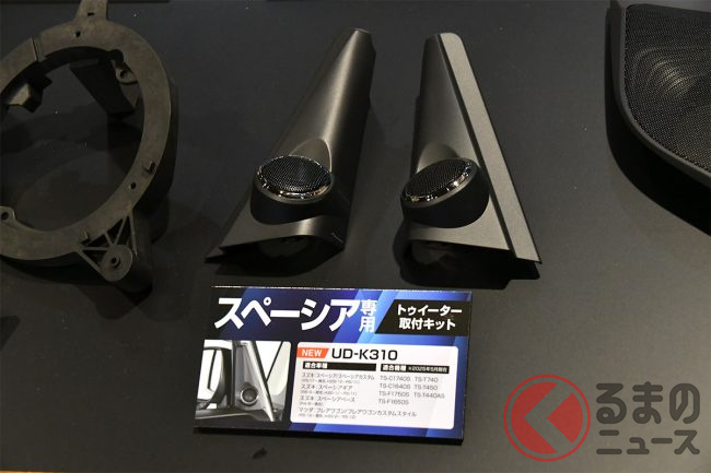 まず体験したデモカーは、スズキのスペーシアです。軽スーパーハイトワゴンとしてN-BOXと人気を二分するスペーシアですが、こちらには新商品“Fシリーズ”の17cmセパレート2ウェイスピーカー(TS-F1750S)をスペーシア専用設計のトゥイーター取付キット(UD-K310)とインナーバッフル(UD-K536)を用いて装着しています。
