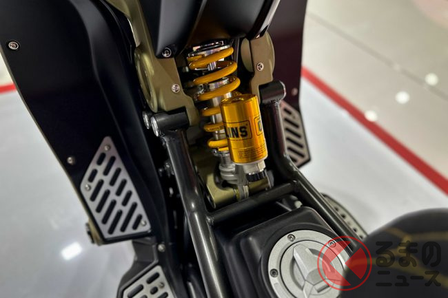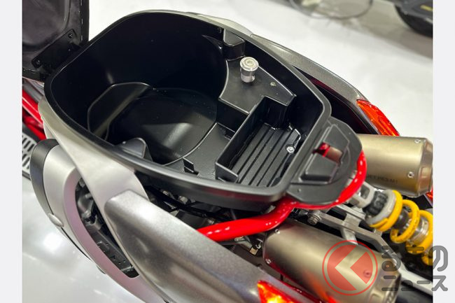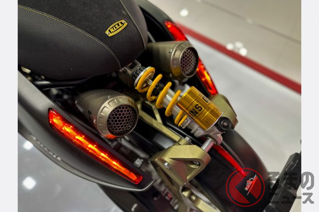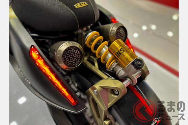 排気系にはアクラポヴィッチ製のツインエキゾーストが選ばれ、シート下を通り抜けてアップマウントされるというユニークなレイアウトが特徴です。リアサスペンションには、リンクを介してオーリンズ製のピギーバック式ユニットが備わります。