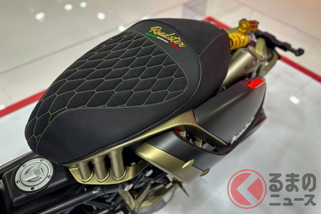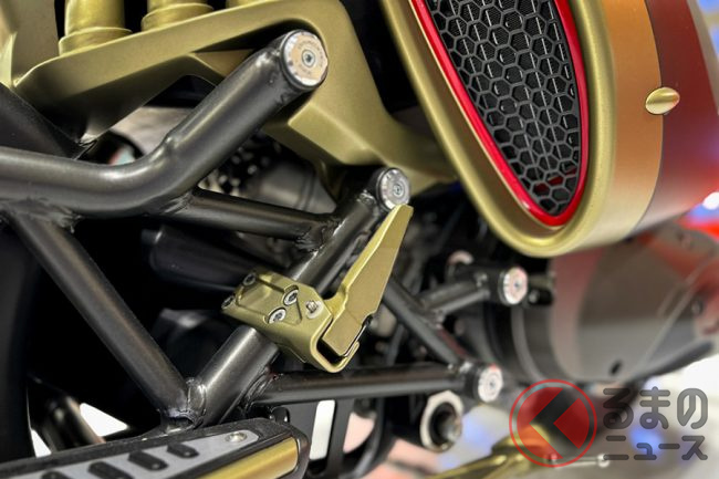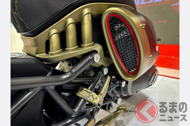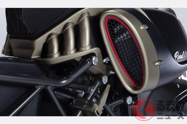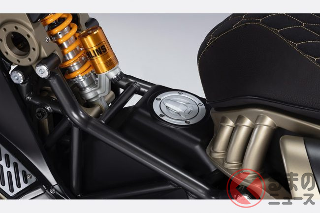 独自のスタイリングに貢献しているのが、ラジエターの配置方式です。クラシカルなデザインの大型テールカウル入り口には大きなエアインテークが設けられ、その内部、ボディの左右にラジエターが収まるサイドラジエター方式が採用されています。