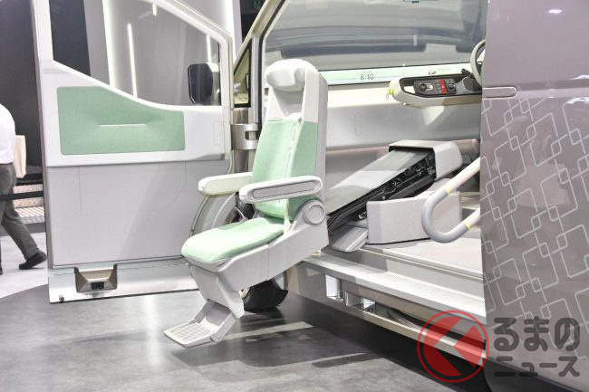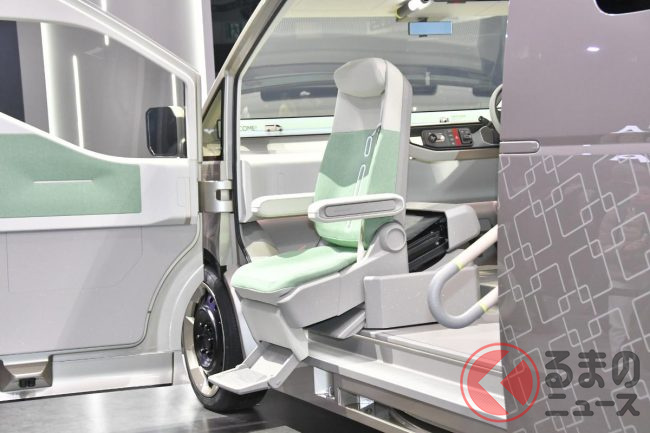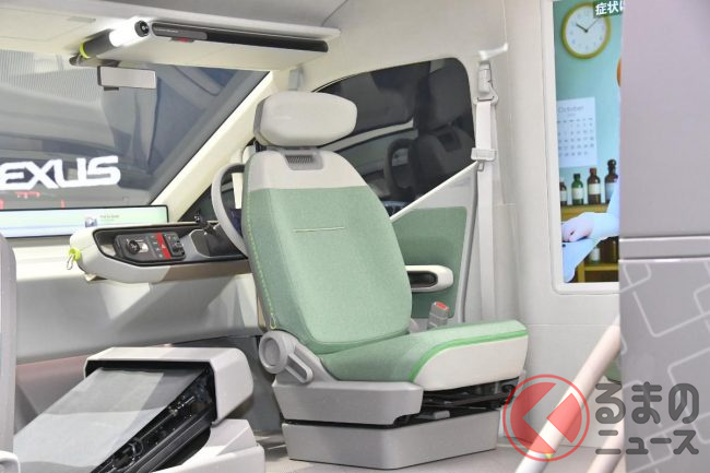 一方、ハイルーフのスーパーロング版は移動診療車として展示され、助手席はリフトアップチルトシート、後席はベッドとしても使える横向きに座れるベンチシートを採用し、運転席を後ろ側に回転することで、医師と患者が向かい合えるような提案がおこなわれています。