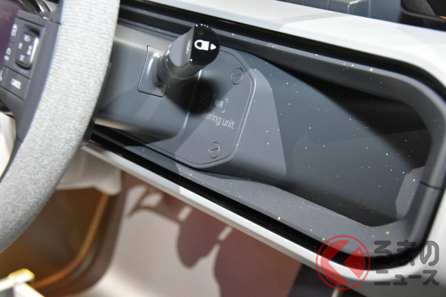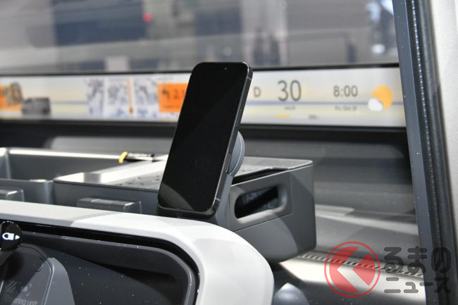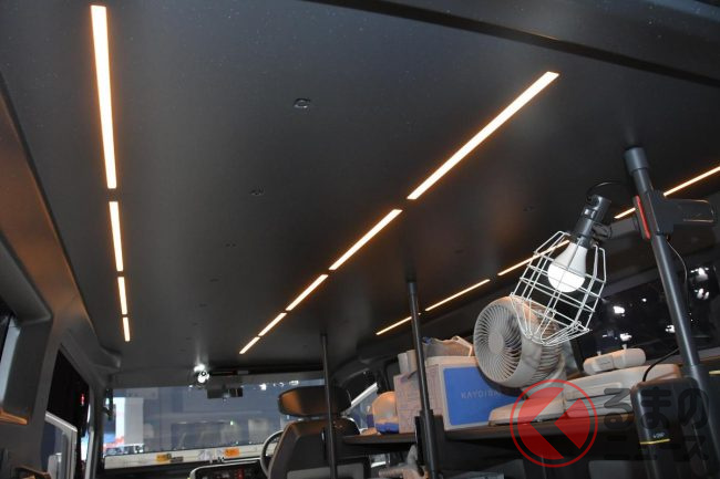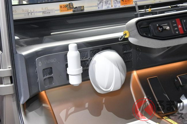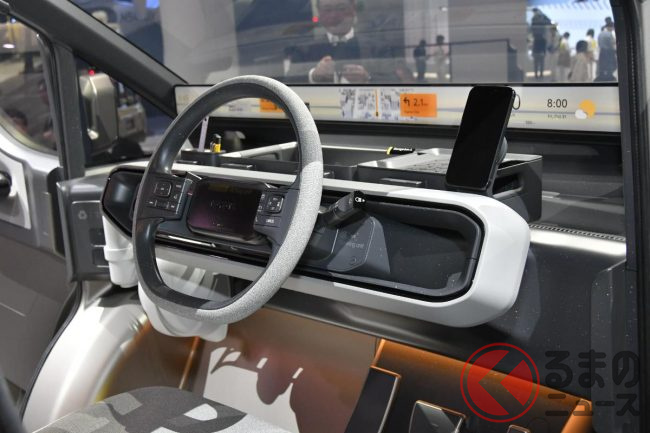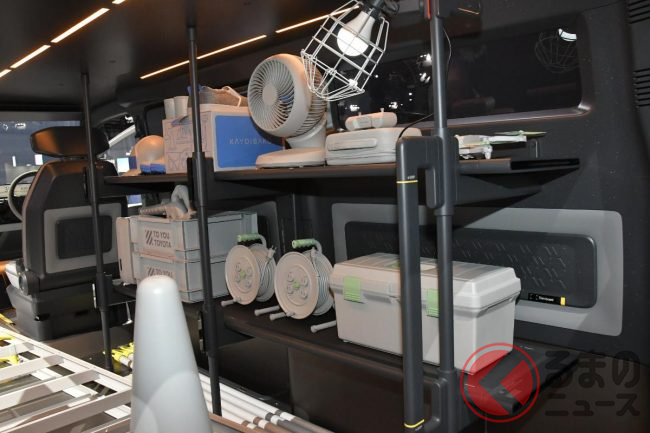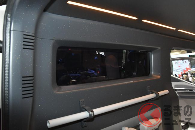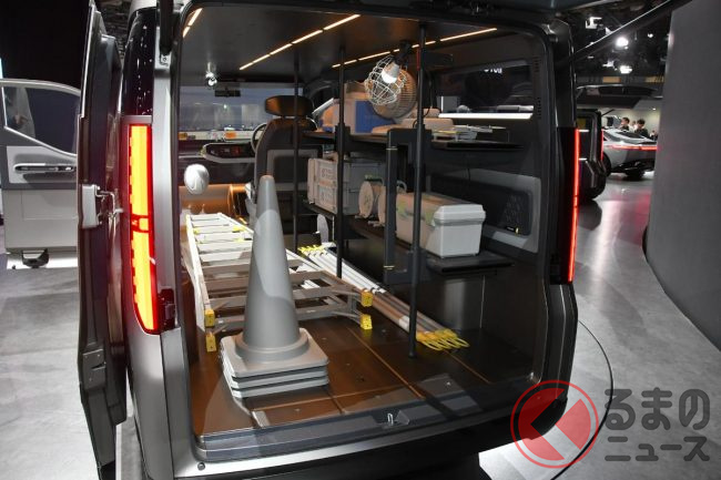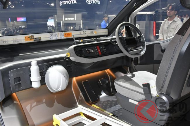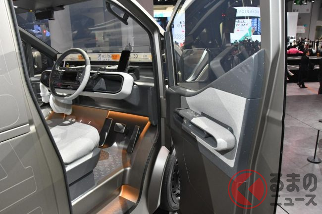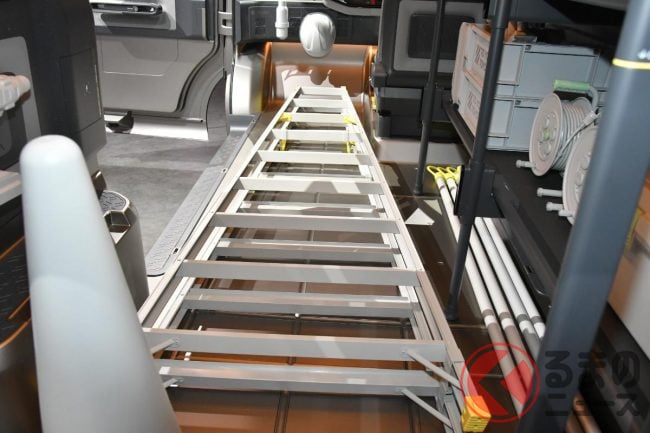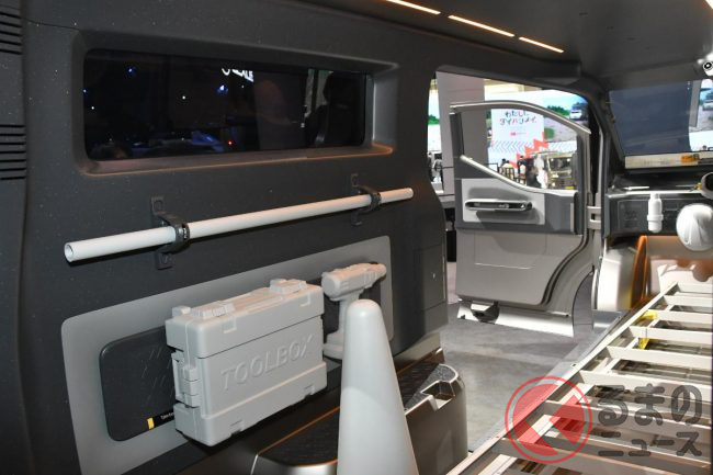 JMS2025で展示されたロング版(標準ボディ)は建築現場などで使われるシーンを想定した“働くクルマ仕様”となっており、車内には棚が設置され、助手席は備わらない(もしくは格納されている)ワンシーター仕様。助手席側はピラーレスの大開口部とすることで、長さのある脚立などもそのまま積載できることをアピールしていました。