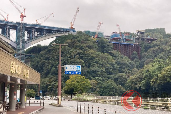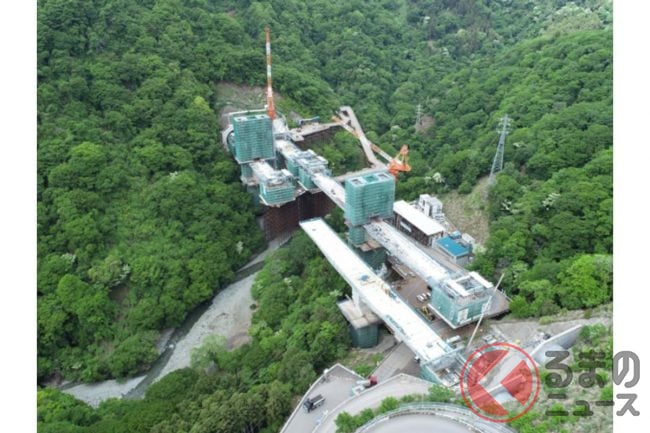 急峻な谷に架けるため、「インクライン」と呼ばれる工事用の昇降設備など、大規模な仮設設備を組んで建設が進められています。