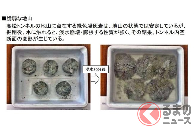 さらに、この地域特有の「緑色凝灰岩」という地質は、水に触れると膨張して崩壊する性質を持っており、工事は困難を極めているといいます。