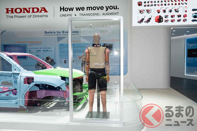 なお、ホンダは四輪領域の製品として歩行者への危害を軽減するために1998年に世界で初めて開発された歩行者用ダミーの最新モデル「PolarIII」も展示。