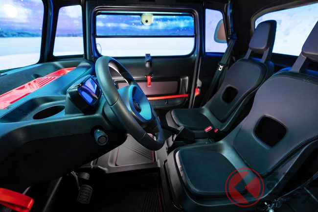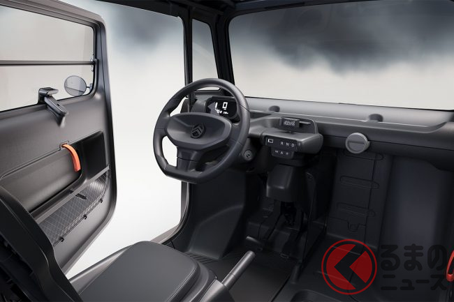 シフトレバーの代わりとして、ステアリング横に「R」「N」「D」のシンプルなボタン類が並びます。なお、ドアミラーは固定式で、後方を確認するルームミラーは搭載されていません。