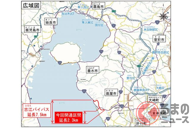 古江バイパスの総延長7.5kmのうち、2008年に垂水市新城まさかり交差点~鹿屋市花岡町交差点にかけての3.9kmが開通し、2011年には鹿屋市花岡町交差点~同市古里町交差点にかけての1.3kmが開通しています。