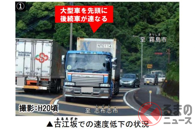 それでも坂道が多く、交通の流れが阻害するスポットが発生してしまい、大型車両が思うように速度を出せずに後続車両を引き連れるようにして渋滞が発生してしまう例も報告されています。
