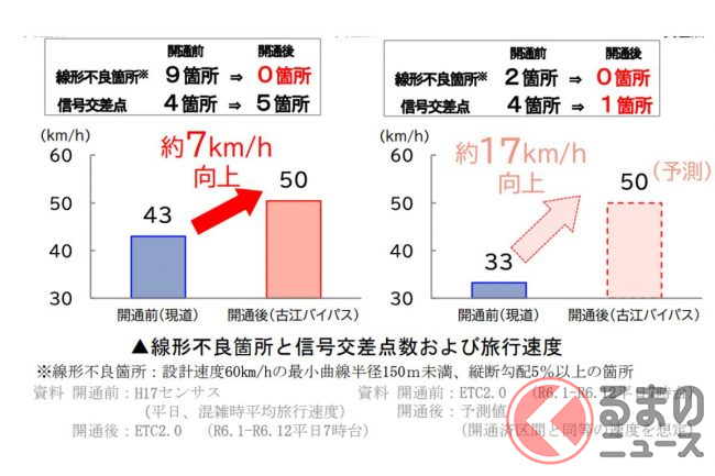 また国道220号には同区間に11カ所の線形不良、8カ所の信号交差点が存在しましたが、古江バイパスでは線形不良はゼロになり、信号交差点は5カ所となっています。