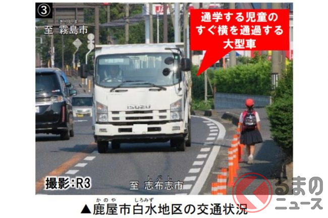 また、道中には近くの学校に通う児童・学生も利用している歩道が設けられているものの、通行可能なのは片側(山側)だけで、ガードレールのような歩行者を守るような設備もほとんど設置されていませんでした。