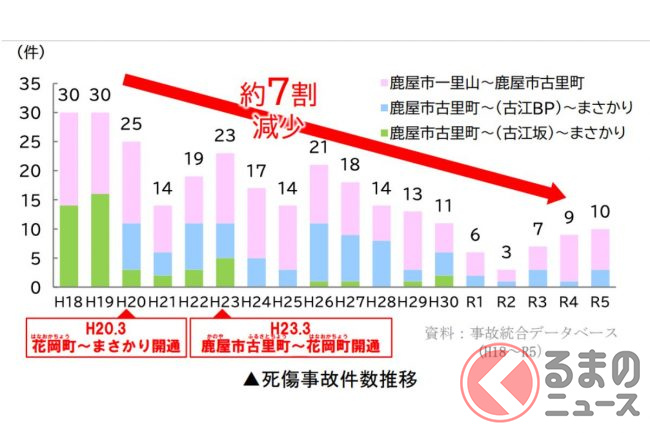 また、交通量が分散することで交通事故の減少、歩行者の安全性向上にも期待できるといい、実際に先行して開通していた区間では死傷事故件数が約7割減少したという成果が出ています。
