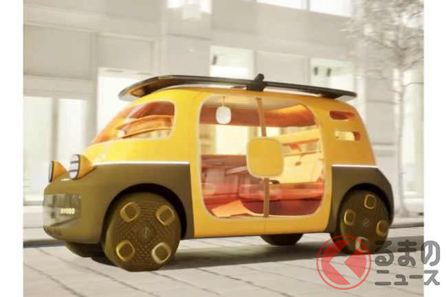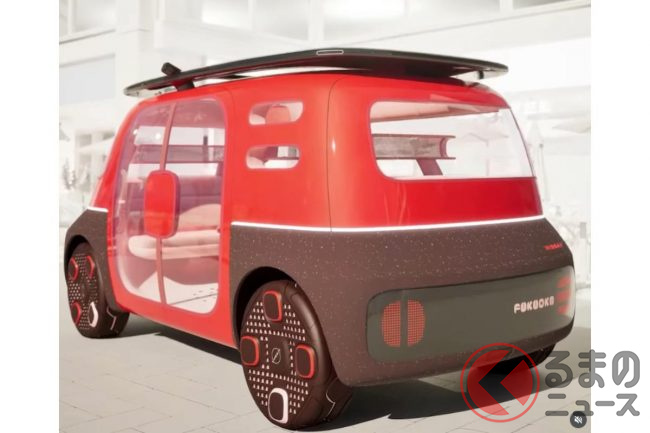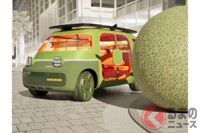 すると、「こちらは、日産が描く“モビリティサービスデザインコンセプト”です。街に魅力と幸せをもたらすシティアイコンであり、思いがけない物語が始まる新しい移動空間を創造します。日産のヘリテージや日本のポップカルチャーを未来へ反映し、各都市のフルーツにインスパイアされています。“フレンドリーな外観”と“ハッピーな内装”の楽しげなコントラストと、色鮮やかで美味しそうなカラーが、地域を元気づけるタイムリーなサービスを表現しています」と日産は説明します。