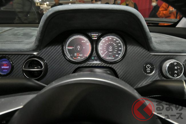 アナログメーターが並ぶ計器盤は、デジタル化全盛の時代にあって逆に新鮮さを感じさせます。ゴードン・マーレーが理想とする「ドライバー中心のクルマ作り」を、最も純粋な形で体現した空間といえるでしょう。