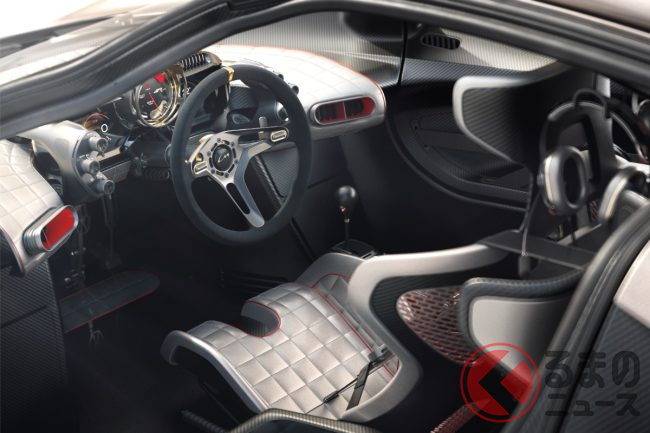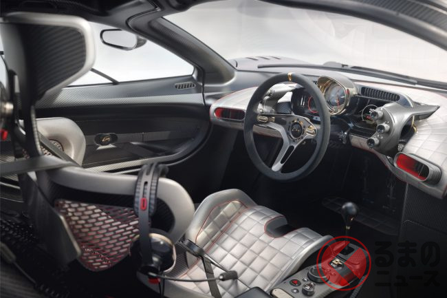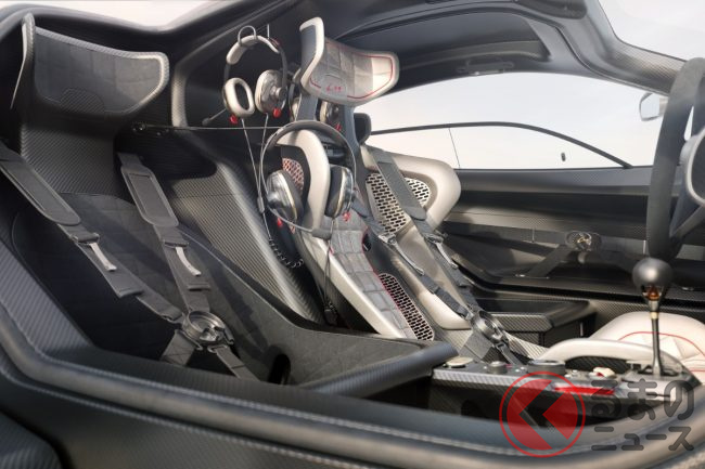 コックピットは3人乗りのセンターシート構成。ドライバーが中央、乗員が左右に配置される独特のパッケージングは、マクラーレンF1への明確なオマージュです。室内はレザーとアルカンターラで仕立てられ、スイッチ類もすべて手の届く範囲に設置。