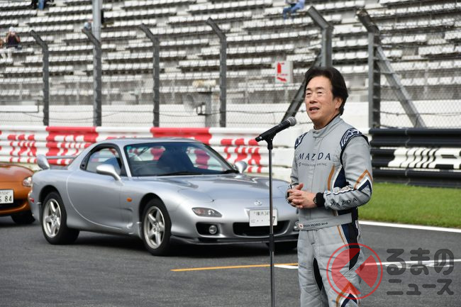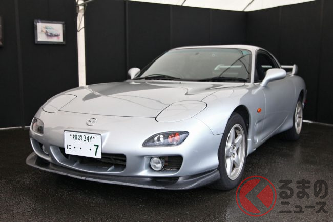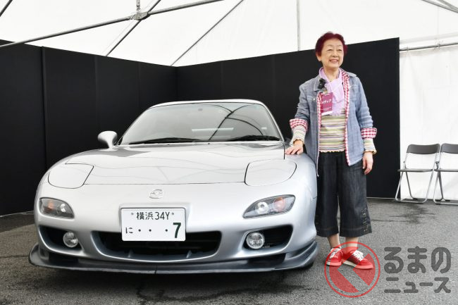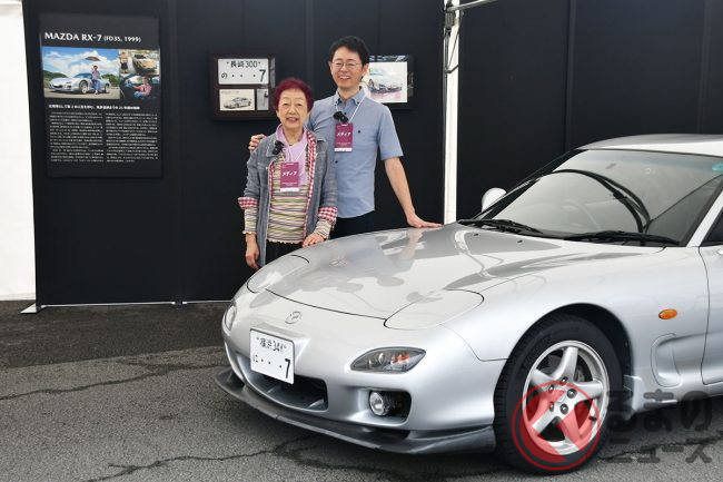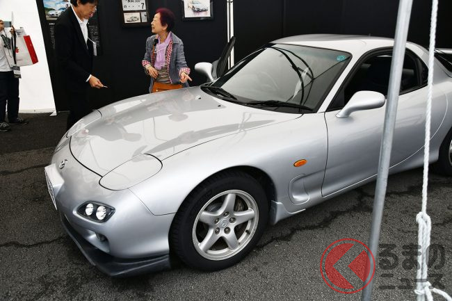 マツダ「“大切”なRX-7」を実車展示! 5速MT×流麗ボディの「2ドアスポーツカー」は「80歳女性」が25年所有! 特別な“7”ナンバーで第二の人生を歩む「FD」 JMSで展示