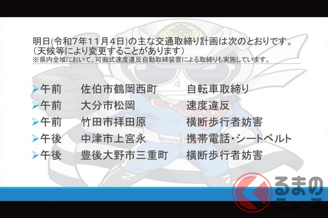 大分県警:交通事故を防止するために、通学時間帯における通学路や子ども・高齢者の通行が多い生活道路をはじめ、交通量が多い幹線道路、その他交通事故が多発している場所において取り締まりをおこなっています。