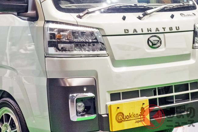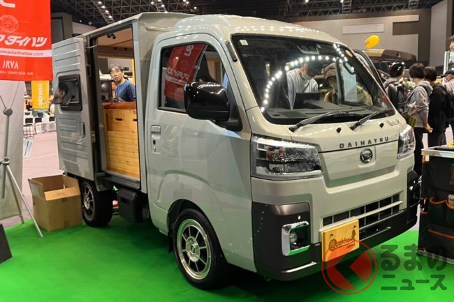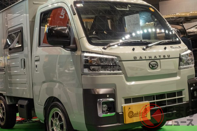 ダイハツ「全面ウッド内装の“軽トラ”」がスゴい! 全長3.4m級「ちいさいサイズ」で「2人寝られる」!? ヒノキ香るハイゼットトラック「ミシマダイハツ“クオッカ”」福岡で実車公開