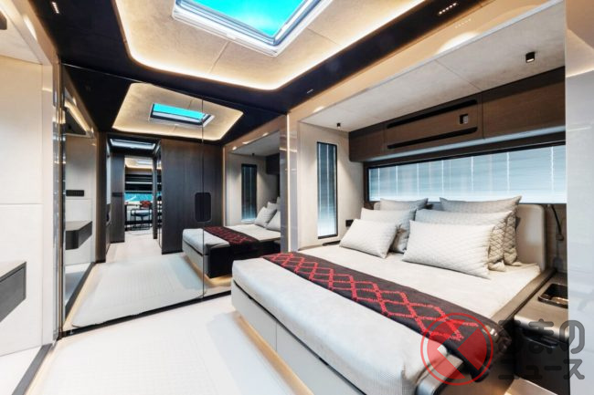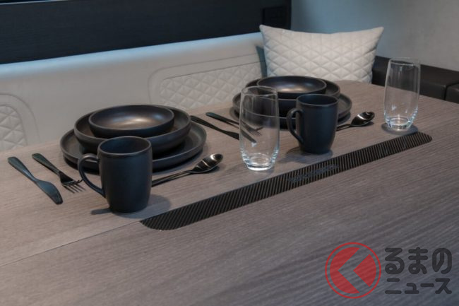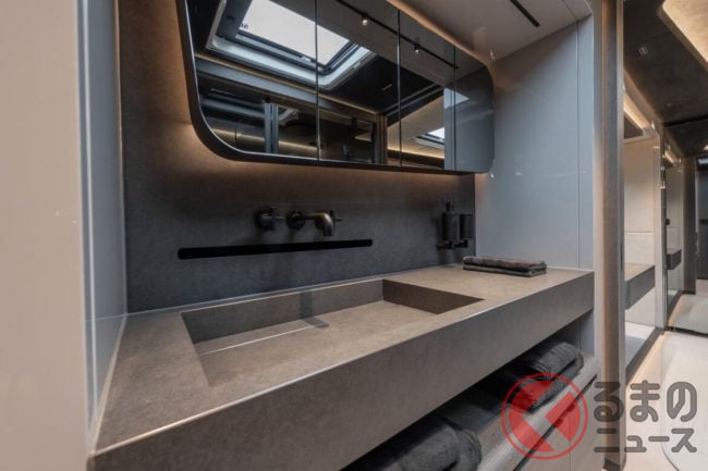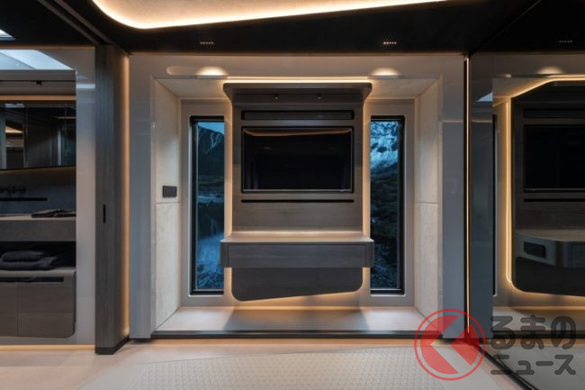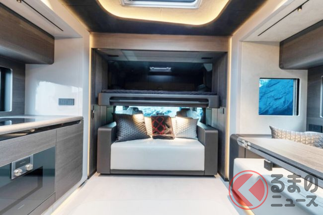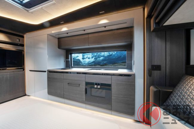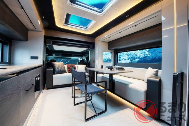リビングにはゆったりとくつろげる2基のソファを配置し、グレー×ブラックで統一されたシックな色使いがモダンな高級感を演出。キッチンには最新のインダクションコンロ、オーブン、食器洗い機、冷凍室付き大型冷蔵庫を備えるほか、ワインクーラーやエスプレッソマシンまで揃い、まさに“走るガストロノミー”と呼べる設備に仕上げられています。