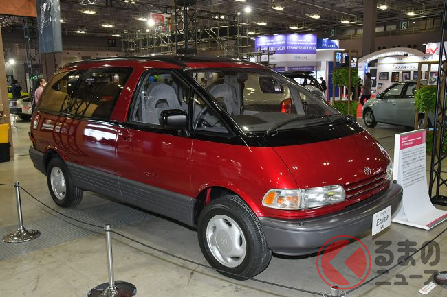 トヨタ「斬新“タマゴ型”ミニバン」が凄かった! “ほぼスポーツカー”な「MRレイアウト」×スーパーチャージャー搭載で「復活」求める声も? JMSに出現した「初代エスティマ」を振り返る