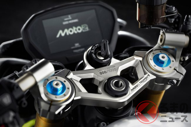 この限定モデルは、トライアンフがMoto2世界選手権の独占エンジンサプライヤーを務めてきた実績を記念するもので、ビレット削り出しのトップブリッジには1台ずつ固有のシリアルナンバーが刻まれています。
