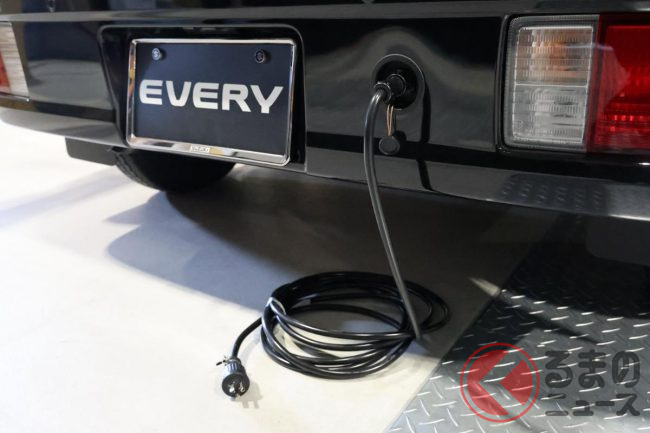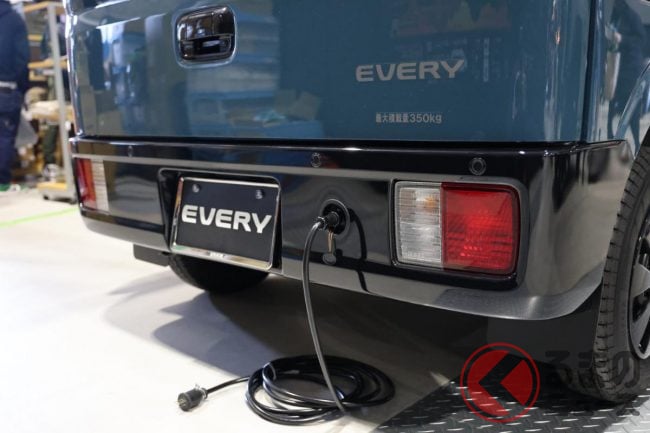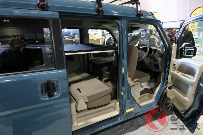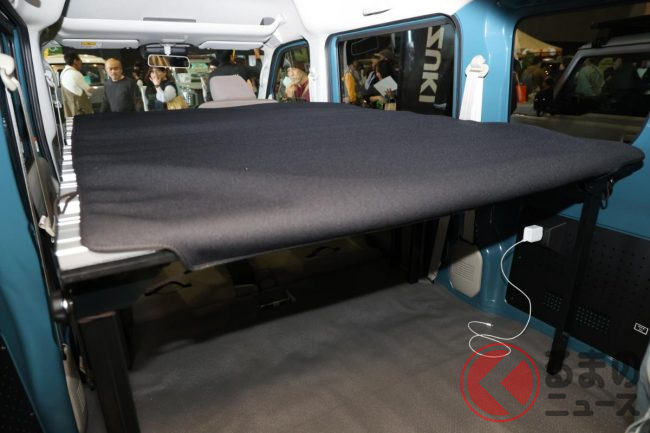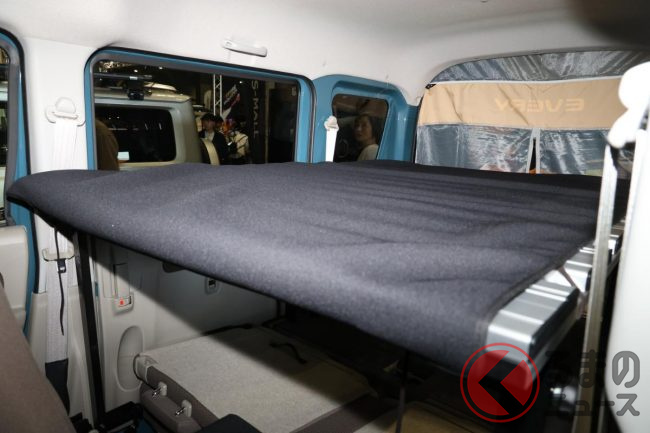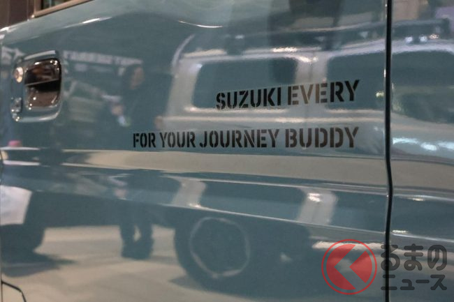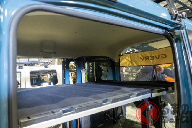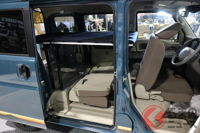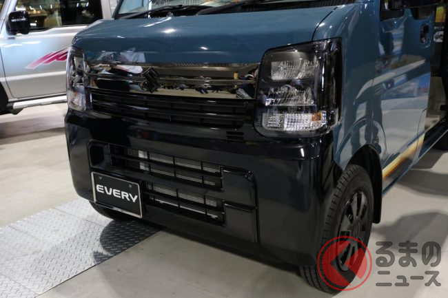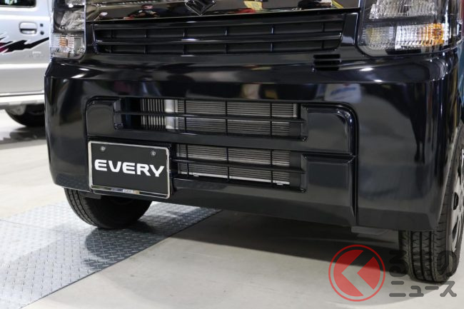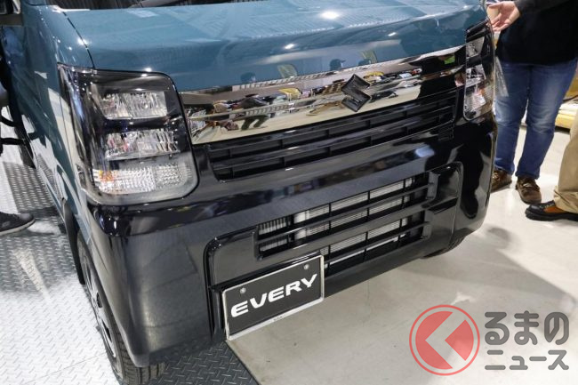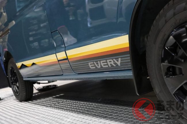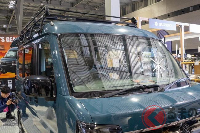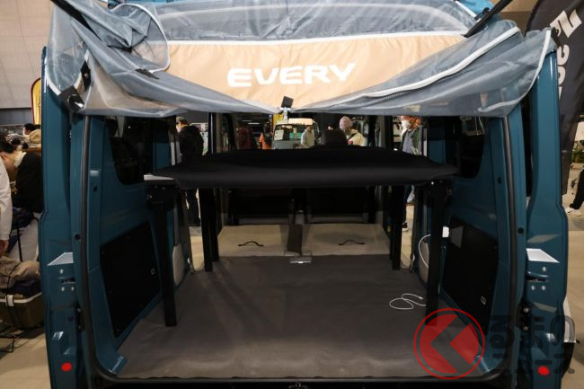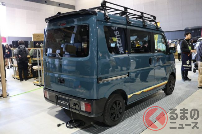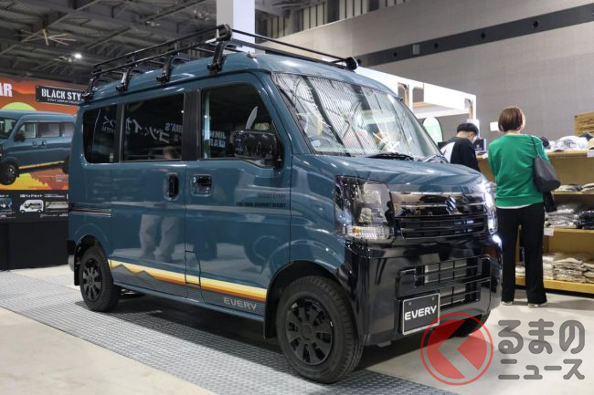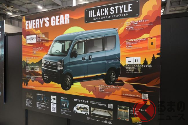スズキ新「エブリイ」公開! 精悍「ブラック仕立て」&“専用デザイン”がイイ! 「画期的な広々車内」で大人2人ヨユーで寝れる! “タフ仕様”な「Jリミテッド」フィールドスタイルエキスポ2025に登場!