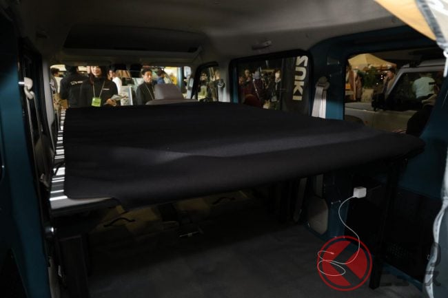 会場のスタッフによると、このエブリイ Jリミテッドのカスタムカーは、災害時の緊急避難場所としても活用できるとのことです。そのためか、会場では多くの家族連れがブースを訪れていました。