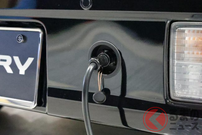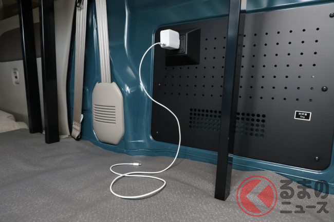 さらに、後部ドア下部には外部電源ソケットを備えており、ここに電源を接続することで、エンジンをかけなくても車内の電化製品を使用できます。