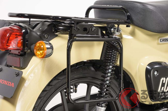 さらに、クロスカブ110 Liteは、ギアスタイルを強調する装備を多数採用。水や泥はね、飛び石などの影響を抑えるフロントとリアのマッドガード、アウトドアの雰囲気を演出する可倒式ステップ、そして足元を引き締めるマットブラックカラーのホイールが特徴です。さらに、太めの17インチセミブロックタイヤを装着し、頑丈さを醸し出しています。