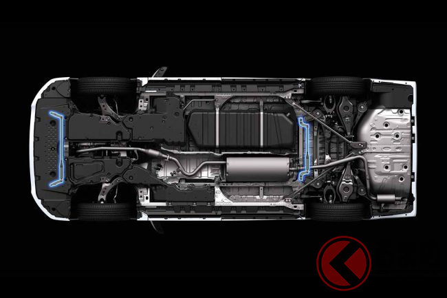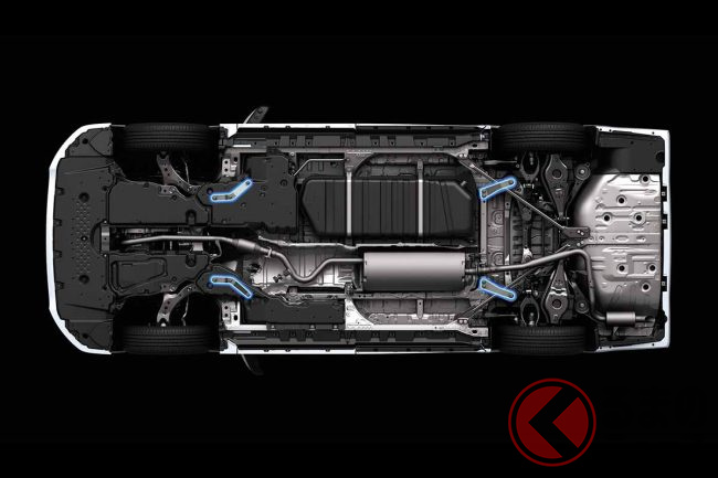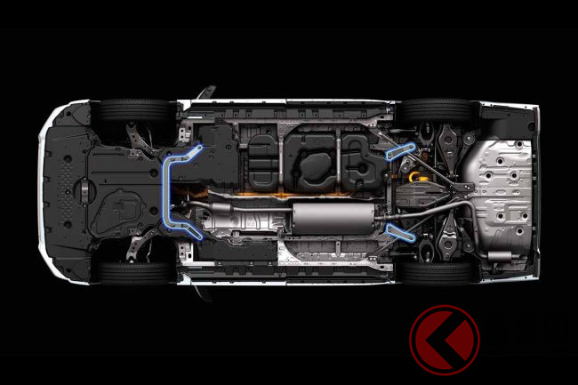 リアバンパースポイラーとドレスアップマフラーは、サイドスカートから続く水平部がリヤの浮き上がりを抑制するとともに、リア中央の垂直フィンが意図しない揺れを低減し、全席で安定した走行を実現します。