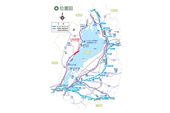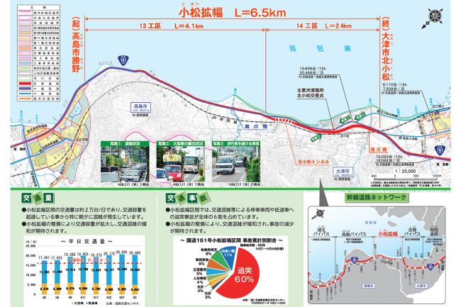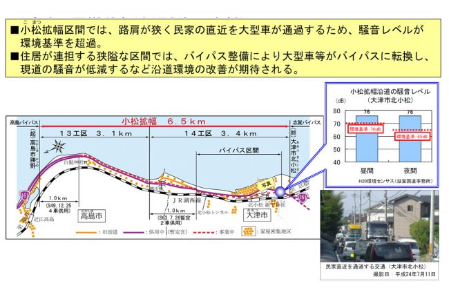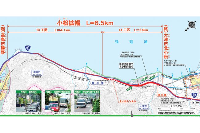 今回開通するのは、これらバイパス群をつなぐために計画された「小松拡幅事業(全体延長6.5km)」のうち、大津市北小松地先の延長2.4kmの区間。