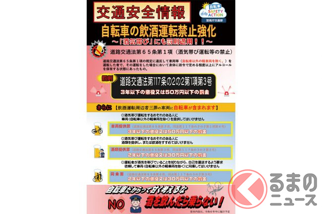 罰則は3年以下の拘禁刑または50万円以下の罰金で、クルマの場合と同様に自転車を運転するおそれがある人に酒類や自転車を提供した人、そして同乗者も、3年以下の拘禁刑または50万円以下の罰金(自転車の提供者)、2年以下の拘禁刑または30万円以下の罰金(酒類の提供者・同乗者)に処されます。