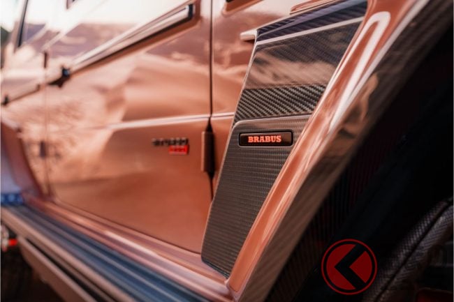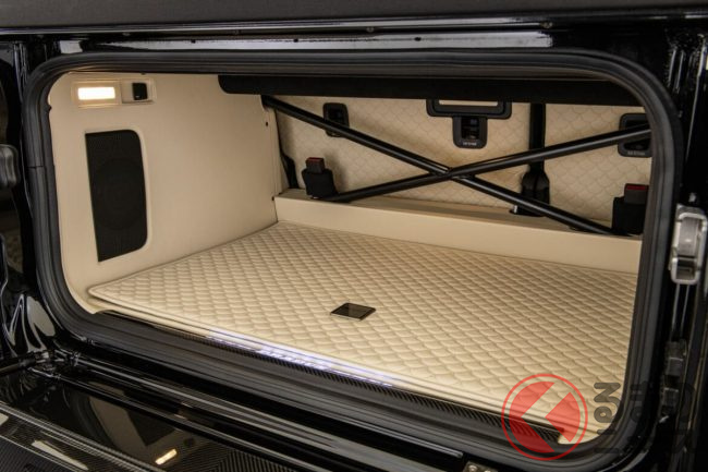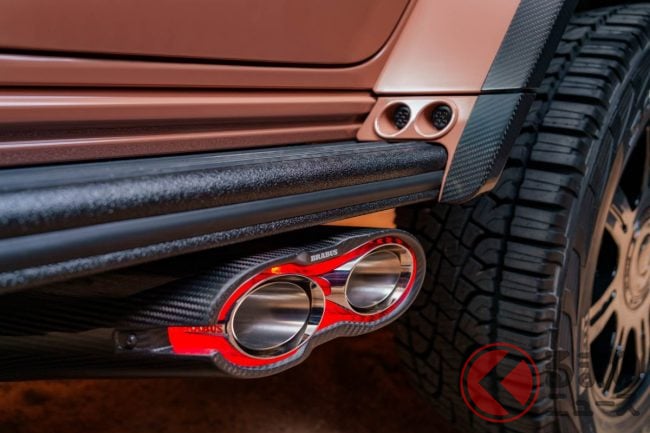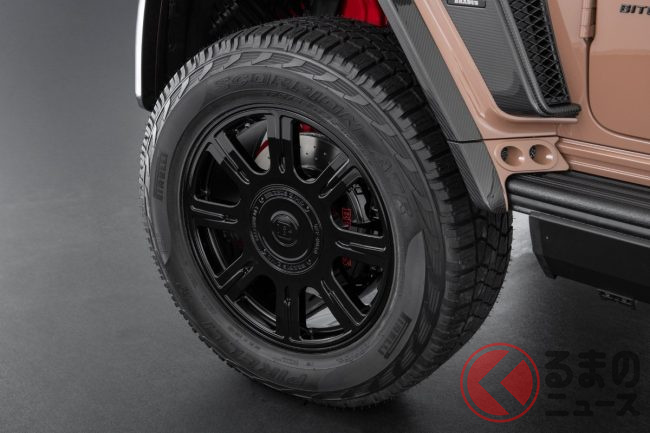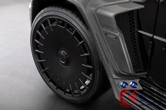外観はペールブラウンの特別塗装やワイドスターフェンダー、フルカーボンの外装パーツを随所に配置。22インチ鍛造ホイール「Monoblock Z-HD」と前後325/55R22サイズのオールテレーンタイヤ「ピレリ・スコーピオンATR」を組み合わせ、圧倒的な存在感を放ちます。