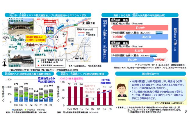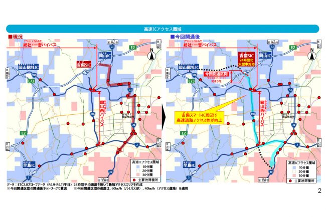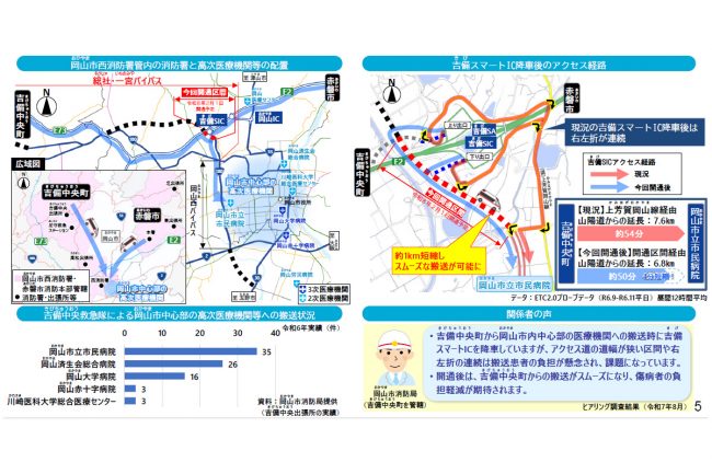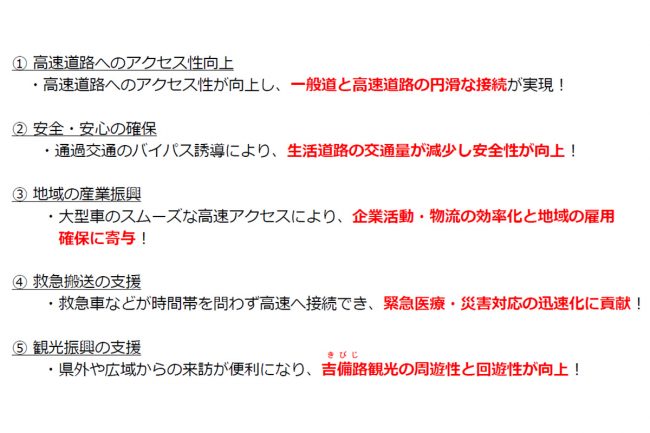 今回の開通により山陽道・吉備スマートICへのアクセスが直結するだけでなく、並行する現道の深刻な渋滞や多発する交通事故の解消にも大きな期待が寄せられています。