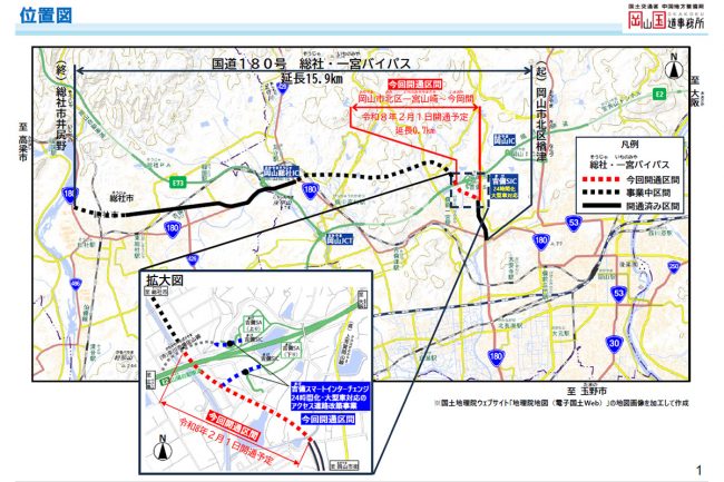 国土交通省岡山国道事務所は、国道180号「総社・一宮バイパス」のうち、岡山市北区の一宮山崎から今岡に至る延長0.7kmの区間を、2026年2月1日に開通させます。