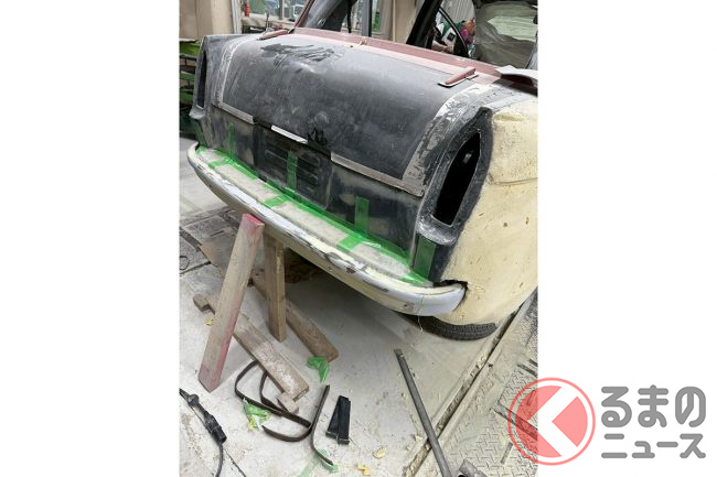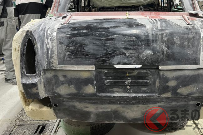 いっぽうのリアはトランクの成形が完了。マーチから形状が大きく変更となるリアフェンダーは発泡ウレタンで形をつくっており、FRPやパテを使って成形していきます。