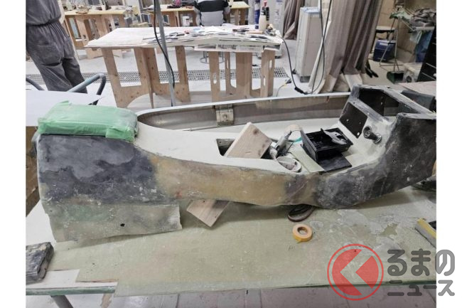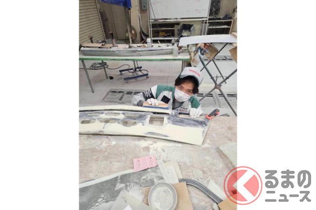いっぽうフロントフェンダーはイチからの製作となり、発泡ウレタンで形を作った後、FRPで成形し、曲線を出しているところだといいます。
