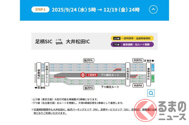 工事は12月19日の24時までを予定しており、この交通規制期間中も大井松田IC、鮎沢パーキングエリア(PA)、足柄サービスエリア(SA)、足柄SIC、御殿場ICは通常通り利用できるとしています。