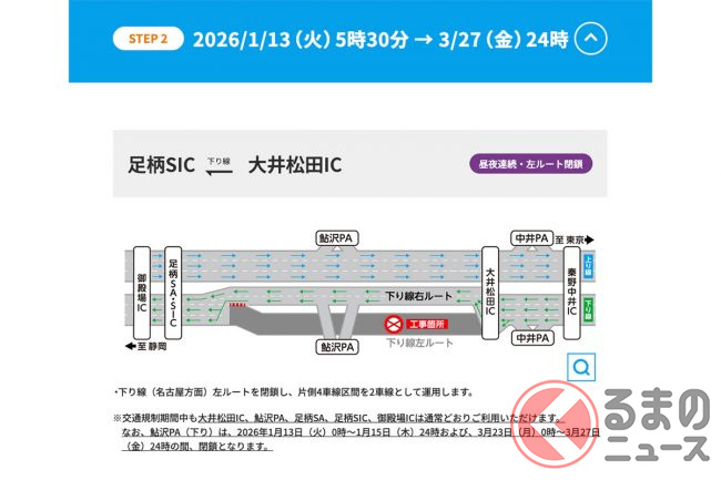 また、後期は工事期間中の各IC、SA・PAは通常通り利用できるとしていますが、鮎沢PA(下り線)のみ、2026年1月13日0時から1月15日24時にかけ、また3月23日0時から3月27日24時にかけて閉鎖される予定なので注意が必要です。