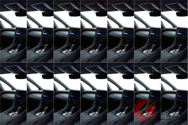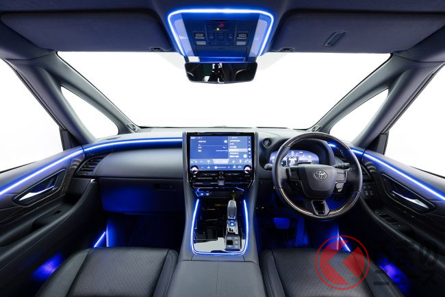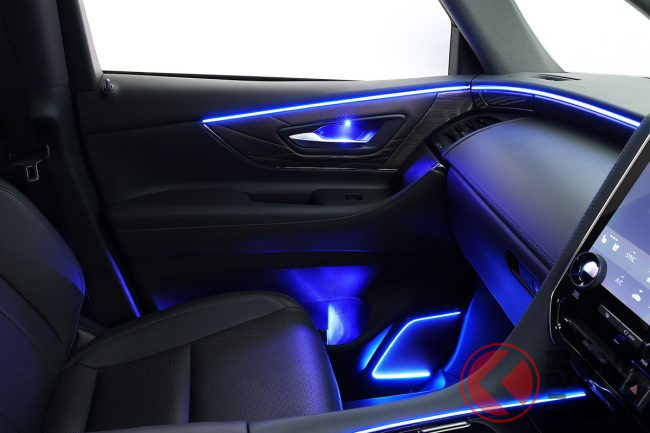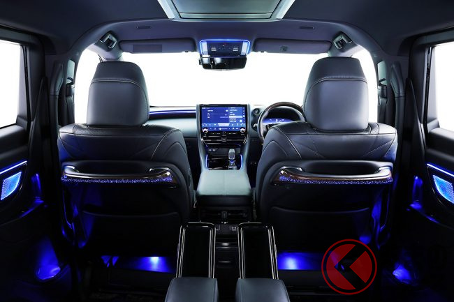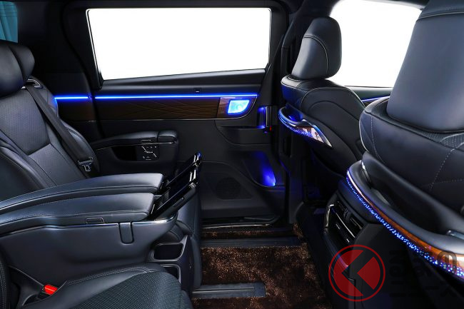 特にリアシートの快適性にこだわるアルファードの特性を考慮し、スライドドアパネル、Cピラーデコライン、さらには運転席と助手席背面のハンドル部にも設定。足元を照らす間接照明も用意されており、後席のゲストを光の演出でもてなします。