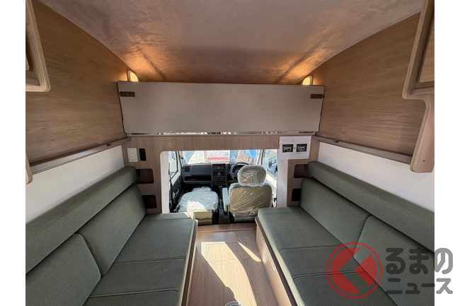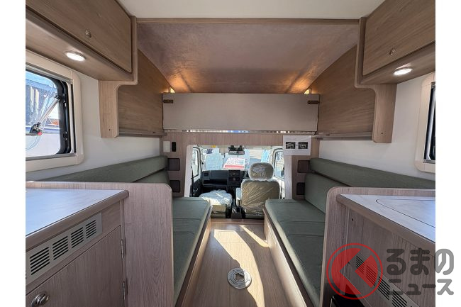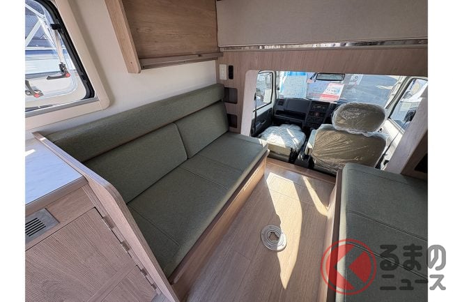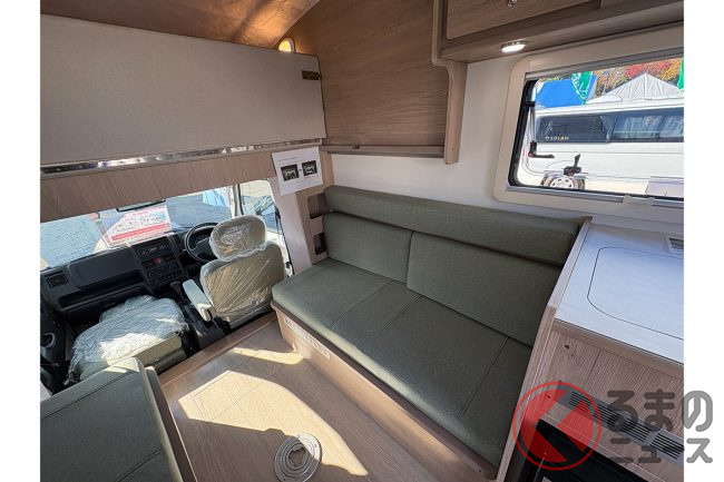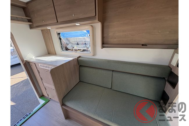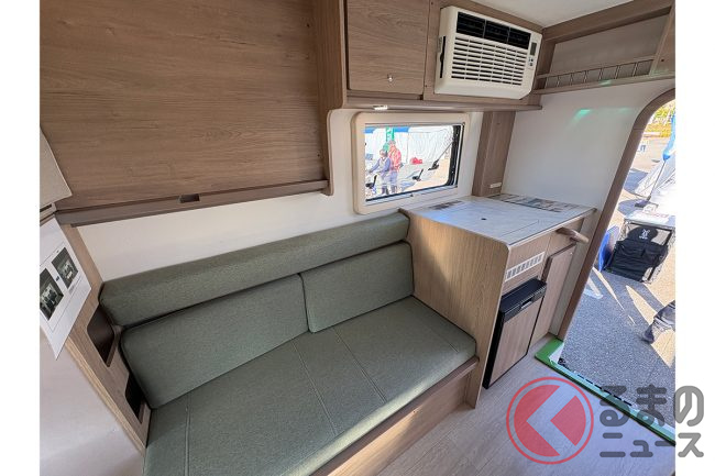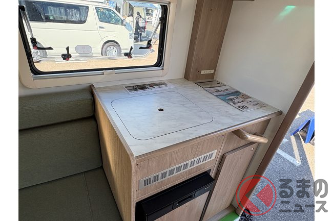 車両の特徴について会場の担当者は、「ACE-Cシリーズは、軽キャンパーの枠を超えた居住性を目指しています。コンパクトながらも家族4人が快適に過ごせる空間を確保しました」と話します。