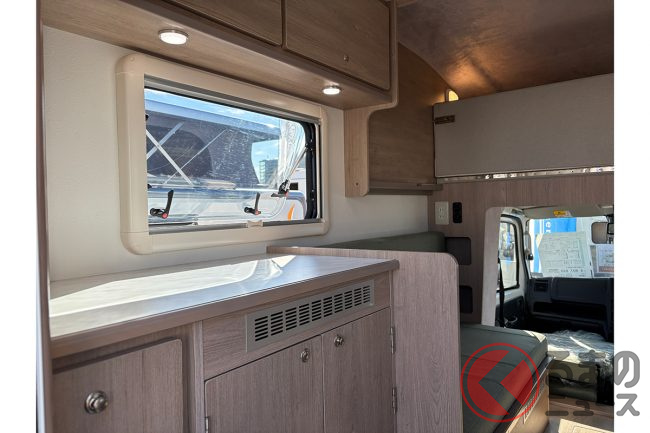 キッチンにはシンク(シャワーヘッド付き)、冷蔵庫、給排水タンク(12L)、収納棚を備え、ベンチレーターや遮光ブラインドも標準装備。