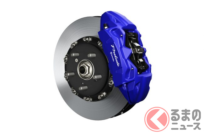 ブレーキはシビック タイプRと共通する構成で、フロントは軽量な約350mmローターにプレリュード専用ブルー仕上げのブレンボ製モノブロック4ピストンアルミキャリパーを組み合わせます。