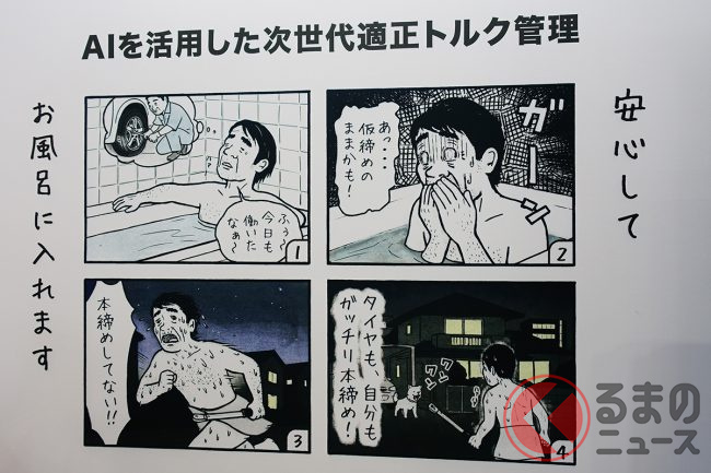 2025年10月29日から11月9日まで開催された「ジャパンモビリティーショー(JMS)2025」で、工具メーカーのKTCブースでは、「安心してお風呂に入れます」という一見不思議なフレーズを掲げ、脱輪ゼロを目指した展示が行われていました。