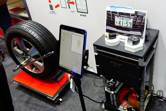 このシステムは、クルマのナンバーを読み込むことで車両に適した締め付けトルクを判定し、連携したトルクレンチで締め付けトルクの測定データを記録・データ化する仕組みなのだとか。